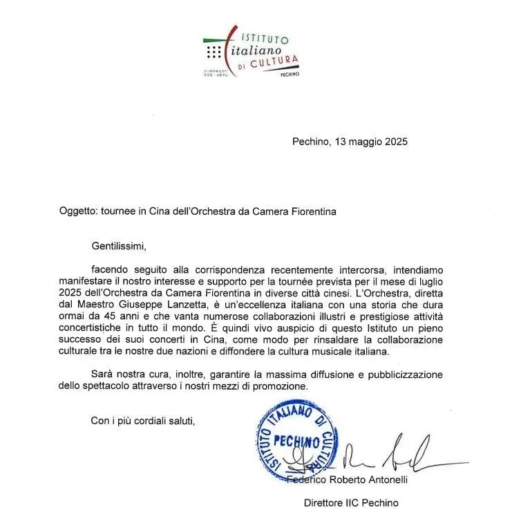 意大利佛罗伦萨管弦室内ORCHESTRA DA CAMERA FIORENTINA——是意大利以传播交响乐和室内乐音乐为宗旨的永久性文化机构。乐团在佛罗伦萨拥有自己的排练以及演出场所PERGOLA THEATRE剧场。在意大利以及海外举办了非常多的成功演出,引起了意大利和国际评论家们的高度好评。